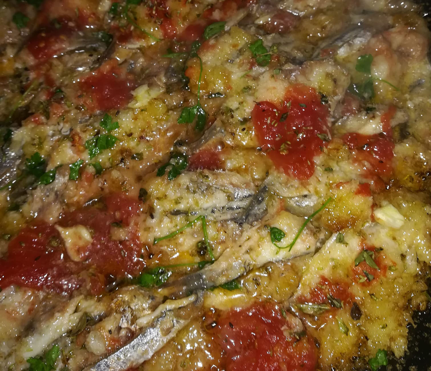 Pulite e affettate le patate molto sottilmente, lasciandole immerse in acqua fredda con un po’ di sale grosso per alcune ore. Successivamente, asciugatele e mettetele in una ciotola, condendole con un po’ di olio e una leggera quantità di sale. In una teglia da forno, versate un filino d’olio e create un primo strato con le patate, quindi disponete le alici, seguite dai pomodori a pezzetti. Condite con sale, olio e origano, quindi aggiungete uno strato di pane grattugiato.