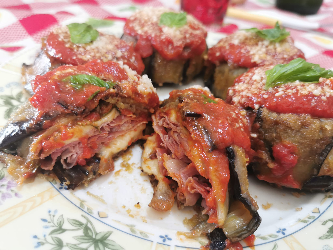Adesso bisogna Comporre i tortini: Quindi Ungere degli stampini da muffin o pirottini con un filo d’olio. Disporre una fetta di melanzana all’interno di ogni stampino, lasciando che i bordi escano fuori. Aggiungere un cucchiaio di sugo di pomodoro , poi uno strato di prosciutto cotto , un po’ di scamorza affumicata , e ripetere con un altro strato di melanzane, sugo, prosciutto e scamorza, chiudere ogni tortino ripiegando i bordi della melanzana verso il centro.