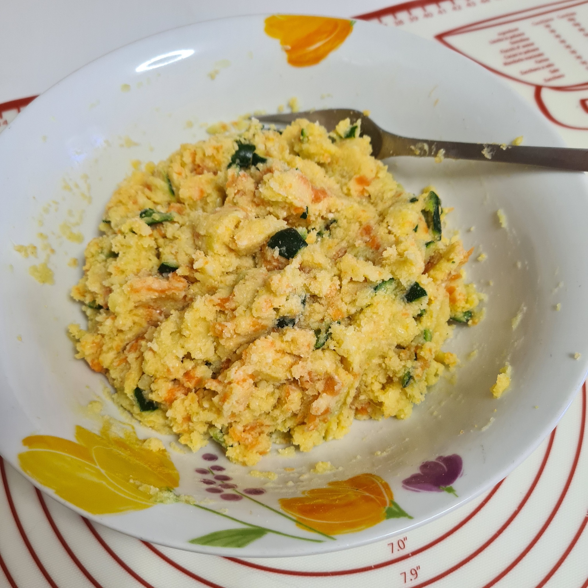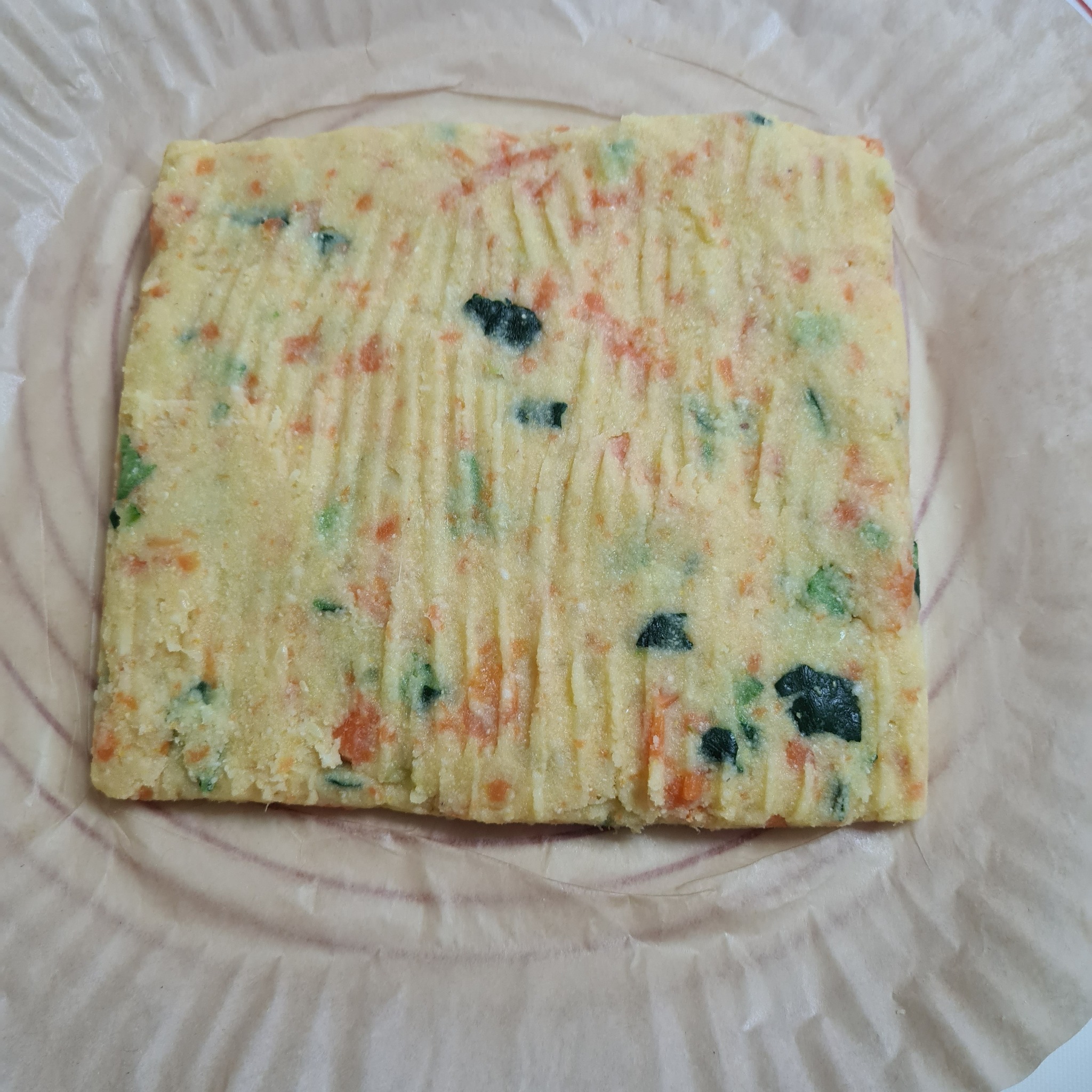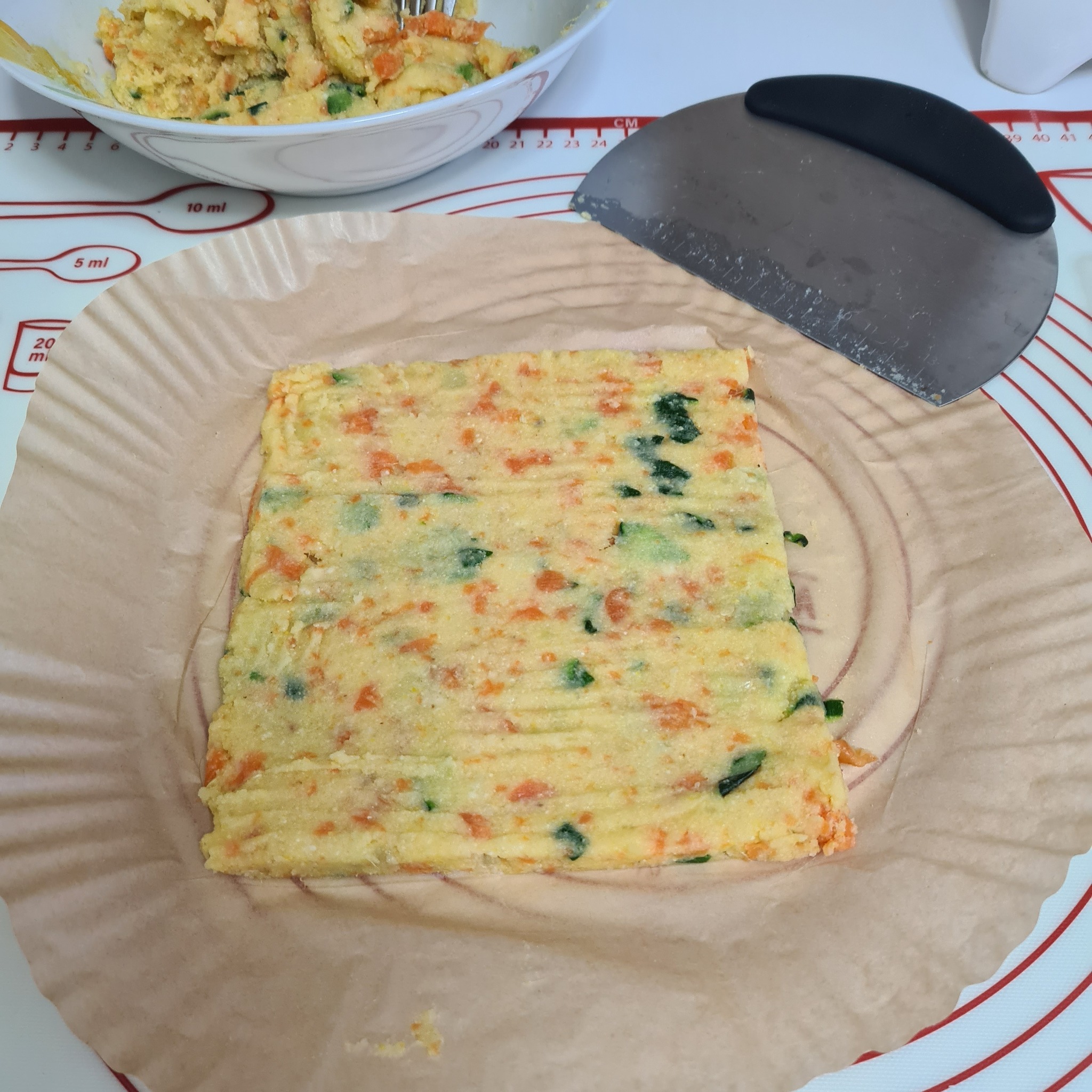 Per preparare dei gustosi tramezzini di verdure, iniziate lessando le patate, le carote e la zucchina in acqua salata fino a quando saranno morbide. Una volta cotte, schiacciatele bene in una ciotola e unite un uovo, 50 grammi di farina di mais, 3 cucchiai di parmigiano grattugiato, 2 cucchiai di pangrattato e un pizzico di sale. Amalgamate bene tutti gli ingredienti fino a ottenere un composto compatto e lavorabile. A questo punto, stendete l’impasto con le mani direttamente su un foglio di carta forno leggermente oliata, dandogli la forma di un rettangolo o quadrato spesso circa mezzo centimetro.