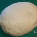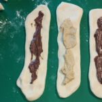 Formate una semisfera, mettetela in una ciotola, coprite con pellicola, e fatela riposare per almeno tre ore. Trascorso il tempo di riposo, dividete l’impasto in tre parti uguali. Prendete la prima parte, avendo cura di coprire le altre, in modo che non secchino. Dividete ancora in tre parti, e con ogni parte formate un cordoncino, schiacciatelo, e farcitelo con la crema alla nocciola e quella di pistacchio.