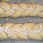 Formate nuovamente dei bastoncini, con i quali formerete la treccia. Ripetete la stessa operazione con le due parti rimanenti. Posizionate le trecce su una leccarda foderata con carta forno, fate riposare ancora un’ora. Trascorso quest’ ulteriore tempo di riposo, mescolate il tuorlo con il latte, e spennellate la superfice delle trecce, guarnite con la granella di zucchero.