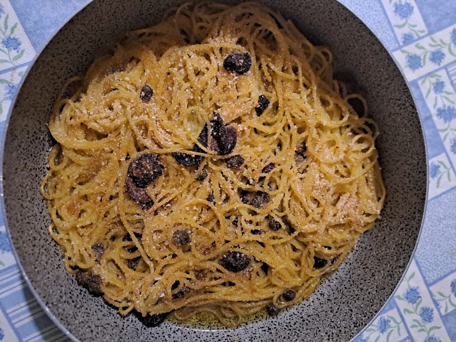 Si tratta di di un primo bianco, senza pomodori, i cui ingredienti principali sono le olive nere di Gaeta, la polvere di capperi di Pantelleria e il tarallo napoletano sbriciolato. Insomma, un mix di ingredienti di regioni diverse, tutte del Sud Italia. La preparazione è molto semplice e veloce e il risultato vi farà leccare i baffi. Provateci!