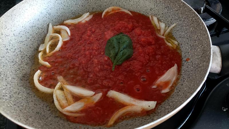 Nel frattempo preparate il sugo al pomodoro. In una padella mettete l’olio e fate imbiondire la cipolla tagliata a fettine; aggiungete la polpa di pomodoro e fate cuocere a fiamma dolce per 5 minuti insieme al basilico fresco; salate ed aggiungete un po’ di pepe o di peperoncino (facoltativo).