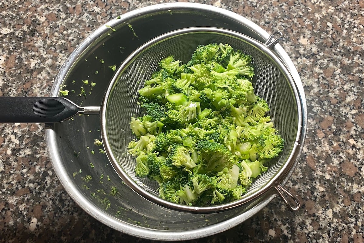 La preparazione del piatto è facile e con risultato garantito. Le quantità indicate vi danno 2 buone scodelle. Iniziate col mondare il broccolo: recidete il gambo a raso e separate le cimette, facendole a pezzetti. Dovrete averne circa 300 g netti una volta mondate, che corrispondono ad un broccolo da circa 450 g all’acquisto. Passatele in un colino grande e lavatele bene sotto l’acqua corrente. Mettetele in una ciotola, copritele con acqua e aggiungete 5 cucchiai di aceto. Tenetele in questo bagno per 15 minuti, muovendole ogni tanto.
