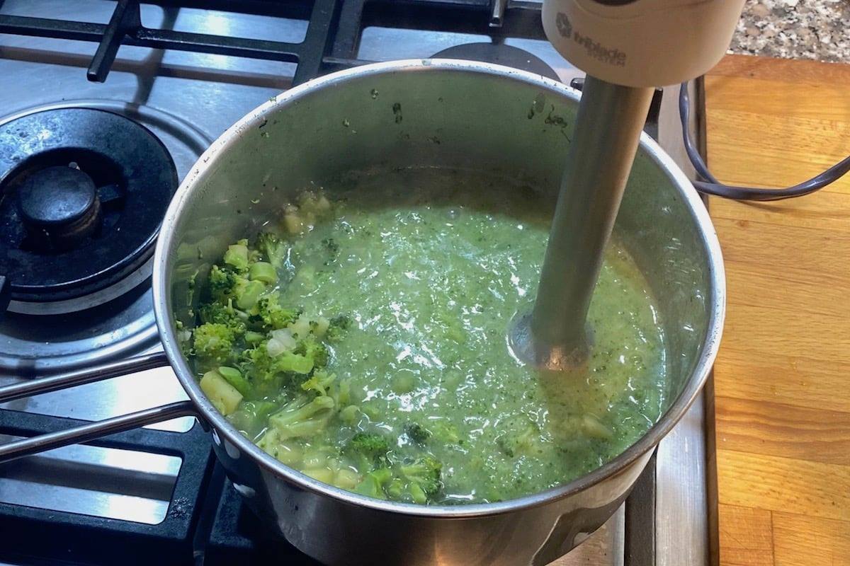 Dopo 5 minuti aggiungete le cimette di broccolo dopo averle scolate nel colino, senza lavarle sotto l’acqua corrente. Il poco aceto che portano con sé aiuterà ad eliminare ogni odore di cavolo in cottura e sarà del tutto scomparso nel piatto finito. Quando patata e cimette saranno tenere, cioè dopo circa 20 minuti, spengete e frullate col pimer direttamente nella casseruola fino ad avere una crema più o meno omogenea secondo i vostri gusti. Se necessario, regolate la densità della vellutata come più vi piace aggiungendo un po’ di brodo o acqua calda per diluirla oppure facendola restringere a casseruola scoperta. Tenete però presente che nel raffreddarsi fino alla temperatura a cui si consuma, si rassoderà alquanto. Assaggiate e mettete a punto di sale, poi grattateci un’ombra di noce moscata. La vostra vellutata è pronta e squisita così, nella sua semplicità.