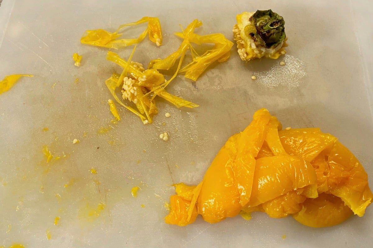 La preparazione è molto semplice e richiede attorno a un’ora. Vi serviranno circa 600 ml di brodo vegetale perfettamente salato, che preparerete in anticipo. Non ha importanza il colore del peperone né il tipo di cipolla. Nelle foto vedete usato un peperone giallo e una cipolla rossa piccola. La prima cosa da fare è spellare il peperone e potete usare due metodi: tenerlo per 10 minuti in acqua bollente oppure nel microonde per 12 minuti al massimo della potenza. Ovviamente, se avete un vostro metodo per spellare il peperone come passarlo sulla fiamma del fornello o tenerlo in forno per una mezz’ora, usatelo tranquillamente. In tutti i casi, appena scottato mettetelo dentro un sacchetto di plastica e lasciatelo raffreddare per almeno mezz’ora, meglio 40 minuti. Passato questo tempo mettetelo sul tagliere, strappate il gambo, apritelo, fatelo a strisce, mondatelo dai semi all’interno e infine girate i pezzi e spellateli.