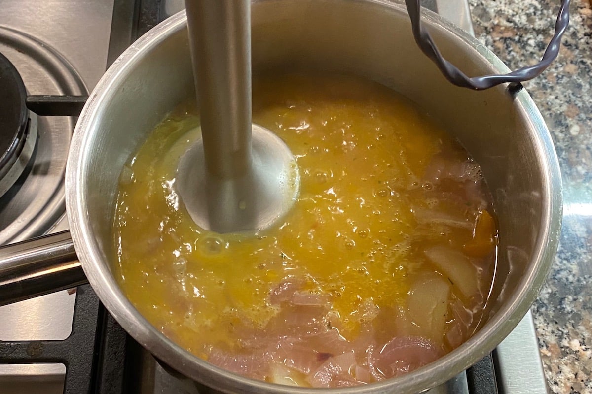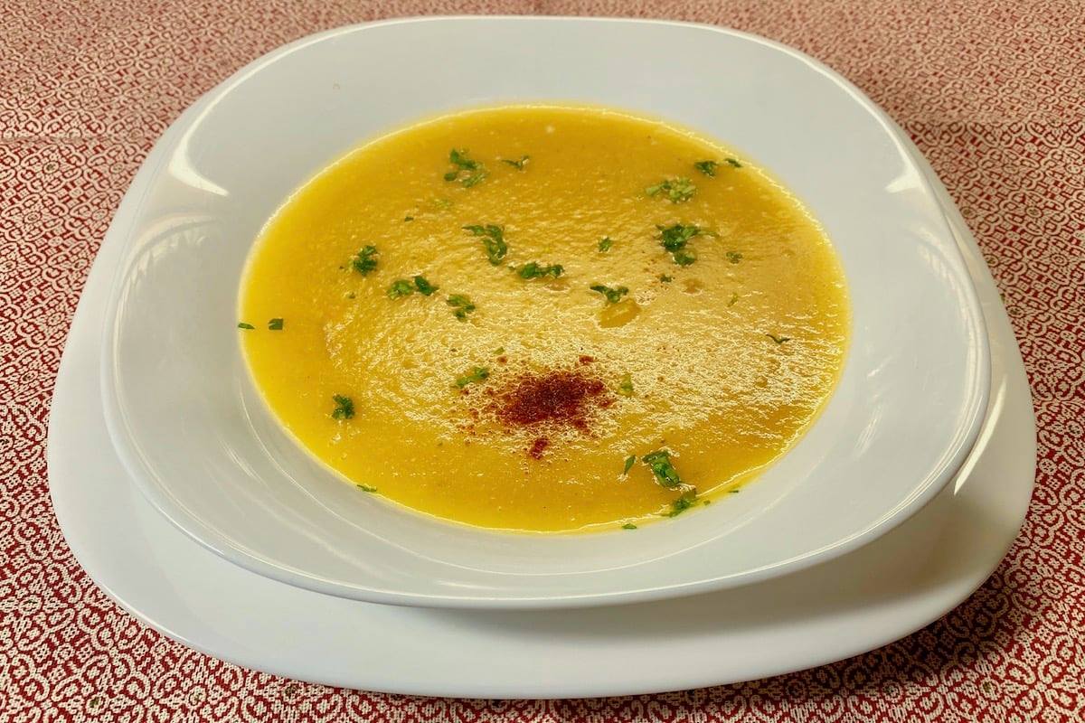 La vellutata è buona calda o tiepida, in estate anche fredda. In genere non si mette formaggio ma spesso si macina sopra del pepe. Servitela spolverata di prezzemolo tritato finissimo e con un bel “C” di olio sopra il piatto e se volete con un po’ di paprika dolce come vedete nella foto, che ci sta molto bene, oppure con lo zenzero in polvere.