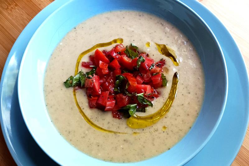 Nel frattempo preparate una dadolata di pomodoro con basilico e sale. Quando la vellutata di verdure tiepida o fredda, impiattate e guarnite con una cucchiaiata di pomodori e basilico ed e una giro di olio: una delizia per un pranzo rinfrescante!