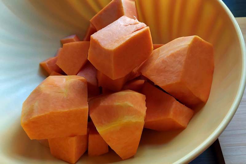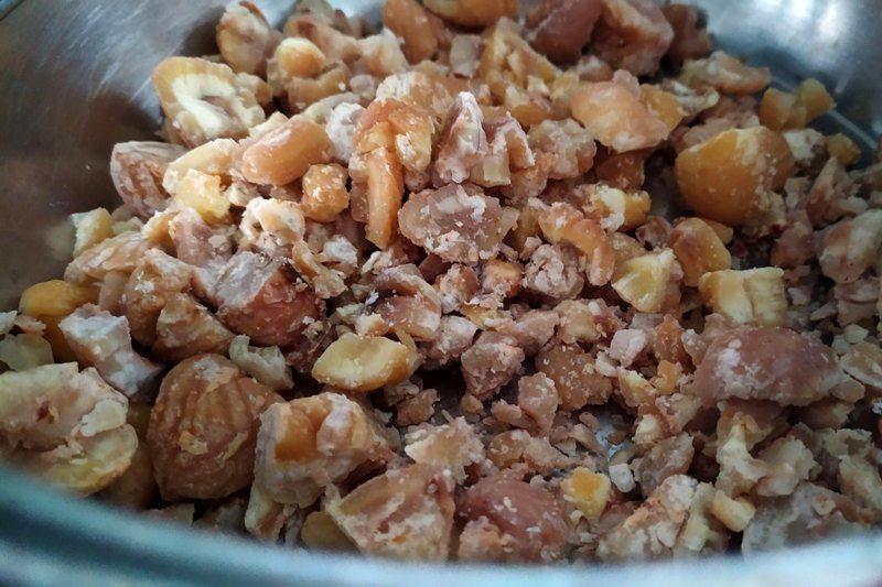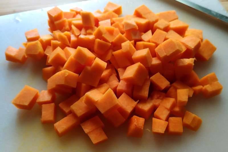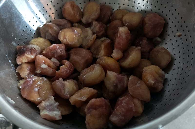 Incidete le castagne con un coltello e cuocetele per circa 30 minuti in acqua bollente salata: dovranno essere cotte, ma non sfatte; raffreddatele sotto l’acqua corrente, sbucciatele, togliete la pellicina, e mettetele da parte. Potete prepararle anche con largo anticipo, utilizzando castagne già lessate, o caldarroste avanzate. Pulite la zucca, pelate le patate, e tagliatele a dadini.