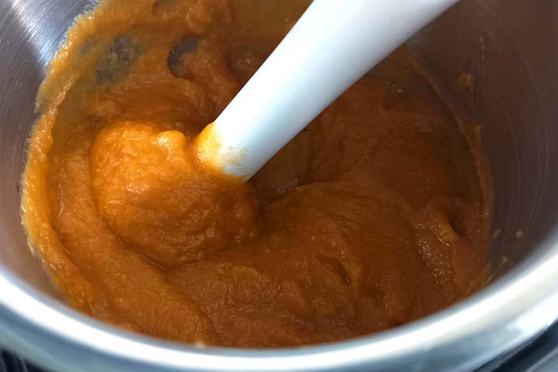 Regolate la consistenza della vellutata come più vi piace: tenetela ancora un poco sul fuoco per farla addensare, oppure aggiungete qualche cucchiaio di acqua per diluirla.