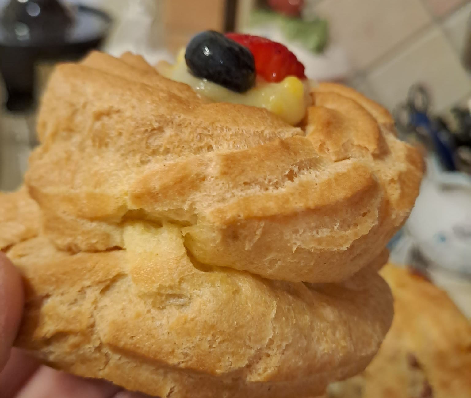 L’ultimo uovo dovete aggiungerlo poco alla volta e solo se necessario. Il risultato finale deve essere ben sostenuto, non liquido. Trasferitelo in una sacca da pasticcere e realizzate dei cerchi del diametro di 9 centimetri sulla pirofila imburrata. Date un altro giro di impasto e cuocete in forno statico a 200 gradi per 15 minuti, nel ripiano più basso. Abbassate a 180 gradi e continuate per altri 15 minuti lasciando il forno leggermente aperto. Spegnete e fate asciugare per 15 minuti prima di aprire. Fate raffreddare i bignè, quindi farciteli con l crema pasticcera che avete messo in un’altra sc a poche. Completate con l’amarena e con la spolverata di zucchero a velo. Le vostre zeppole di San Giuseppe sono pronte.
