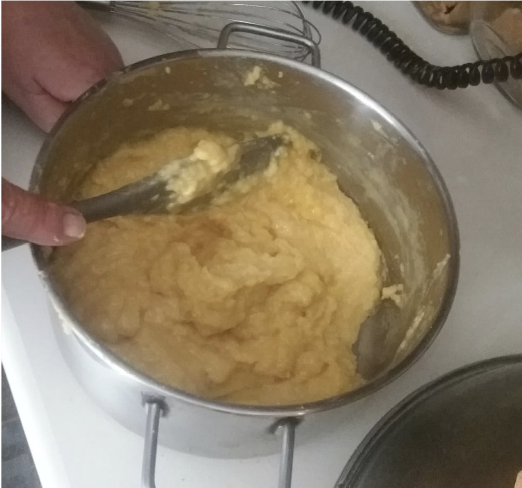 Nel pentolino aggiungete le uova poco alla volta ( se non avete un’impastatrice a gancio K fatevi dare una mano, uno mescola, l’altro aggiunge). L’impasto dovrà avere l’aspetto di una crema pasticciera molto corposa,