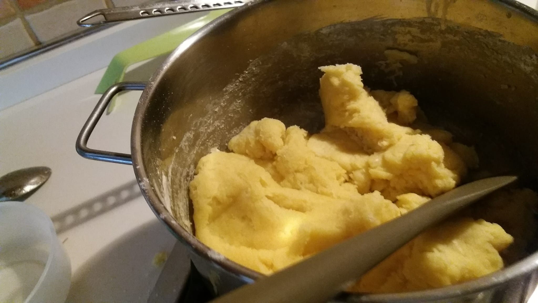 Siamo pronti? Per prima cosa mettete l’acqua in un pentolino, aggiungete il burro a pezzi, il sale, e, mantenendo a fuoco basso portate ad ebollizione. A questo punto togliete dal fuoco il pentolino e aggiungete la farina setacciata. Dopo questo procedimento rimettete il pentolino sul fuoco e fate cuocere mescolando. Sarà pronto quando l’impasto si staccherà dalle pareti. Togliete quindi il pentolino e fate raffreddare.