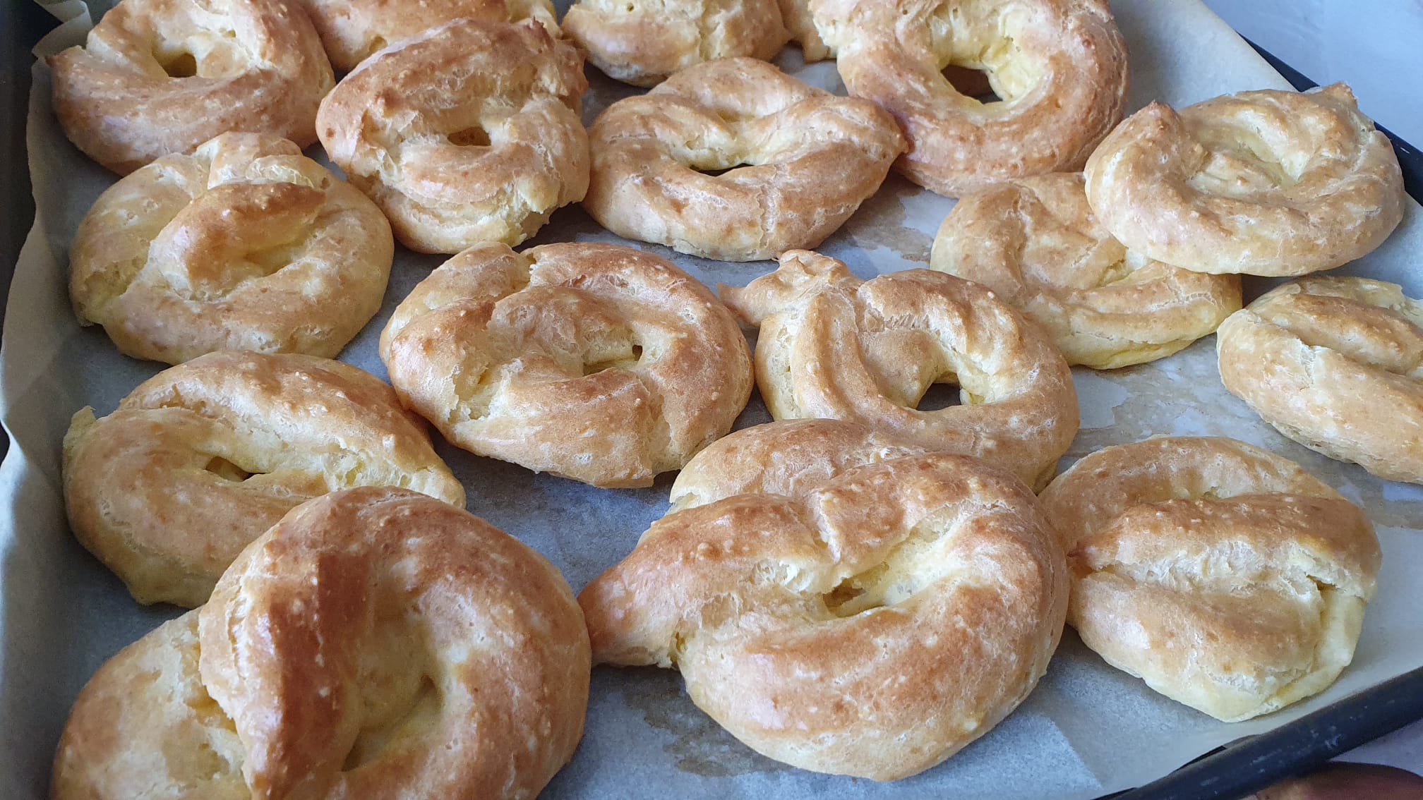 Per prima cosa dovrete coprire una teglia da forno con della carta forno. Mettete il vostro impasto in un sac a poche e usate la bocchetta stellata grande ( n.12). Fate delle ciambelle ( delle zeppole) nella teglia, lasciando un buco al centro ( la classica zeppola).