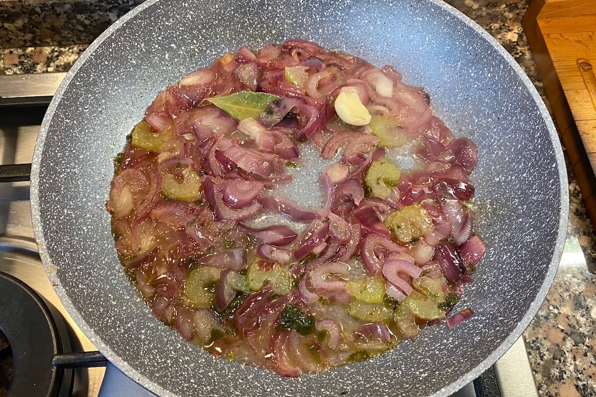 Il piatto è molto semplice e si prepara in circa un’ora e un quarto. Vi servirà una padella da 28 cm di misura, possibilmente antiaderente e dotata di coperchio. Mondate il baccalà da eventuali spine ma lasciate la pelle e tagliatelo a pezzetti grandi quanto la vostra carta sanitaria. Tritate cipolla e sedano e metteteli a soffriggere in padella con 3 cucchiai di olio di oliva. Aggiungete la foglia di alloro intera, un buon pizzico di prezzemolo tritato e uno spicchio d’aglio, intero o tritato secondo quanto ne volete sentire il sapore nel piatto finito.