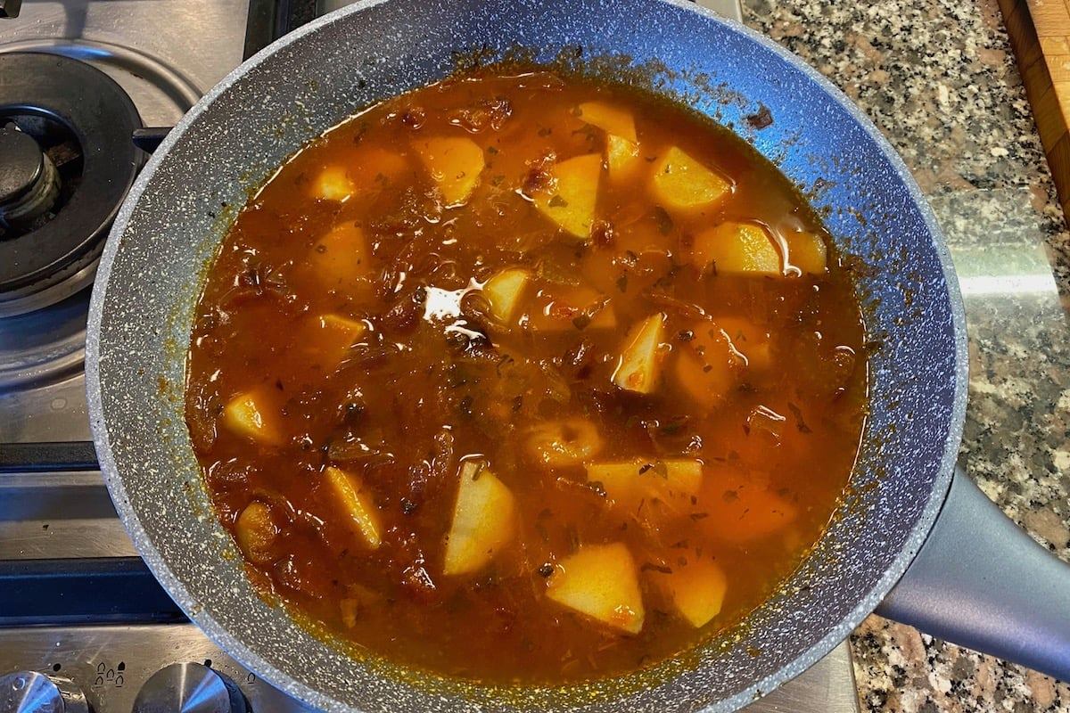 Fate cuocere molto dolcemente per circa 20 minuti, bagnando ogni tanto con poca acqua se necessario, poi togliete la foglia di alloro, aggiungete il pomodoro, bagnate col vino bianco e fate sfumare. Aggiungete le patate tagliate a pezzetti o a fette non sottili e, se volete, una presa di peperoncino, poi coprite tutto con acqua calda. Mettete il coperchio e fate riprendere l’ebollizione, poi fate cuocere a fuoco dolce una ventina di minuti, quelli necessari ad avere le patate quasi a punto. Assaggiate il liquido di cottura e salatelo ma state leggeri, perché la regolazione definitiva la farete 5 minuti prima della fine.