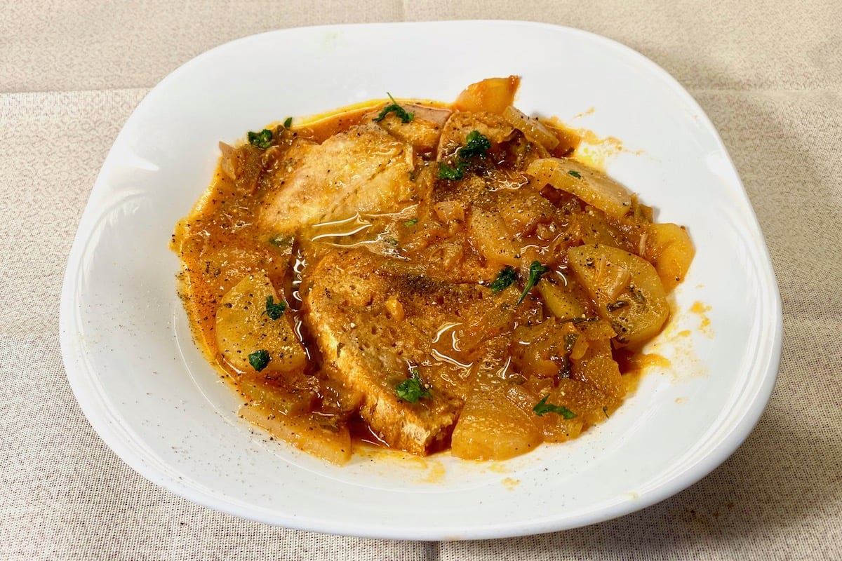 Mettete anche i pezzetti di baccalà con la pelle di sotto, trovando loro posto tra le verdure in modo che appoggino sul fondo della padella. Il liquido in padella dovrà coprire a filo i pezzi di baccalà: se fosse scarso, aggiungete acqua calda perché alla fine il sughetto dovrà essere ben abbondante. Al baccalà saranno necessari circa 10 minuti per cuocersi e lo terrete 5 minuti coperto e gli ultimi 5 senza coperchio e a fuoco vivace. Prima di scoprirlo assaggiate un pezzettino di baccalà e mettete a punto di sale. Se necessario aggiungete altra acqua calda perché il fondo di cottura, come già detto, deve essere abbondante.