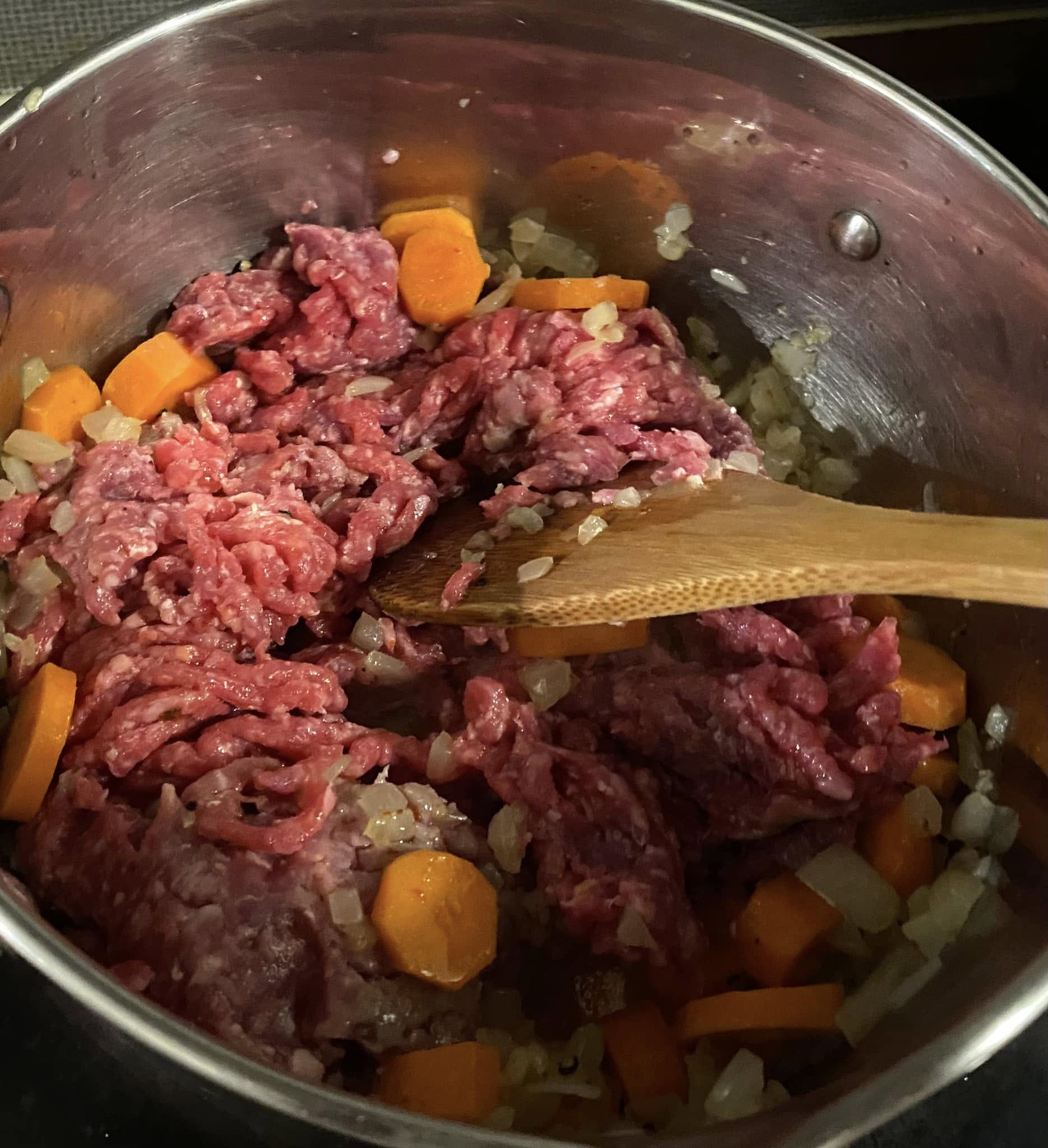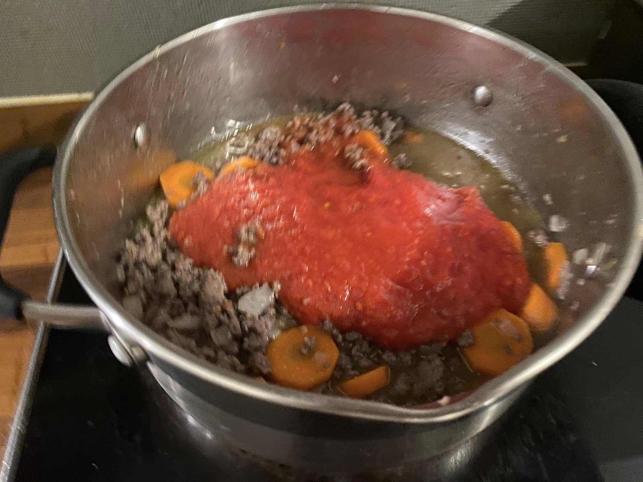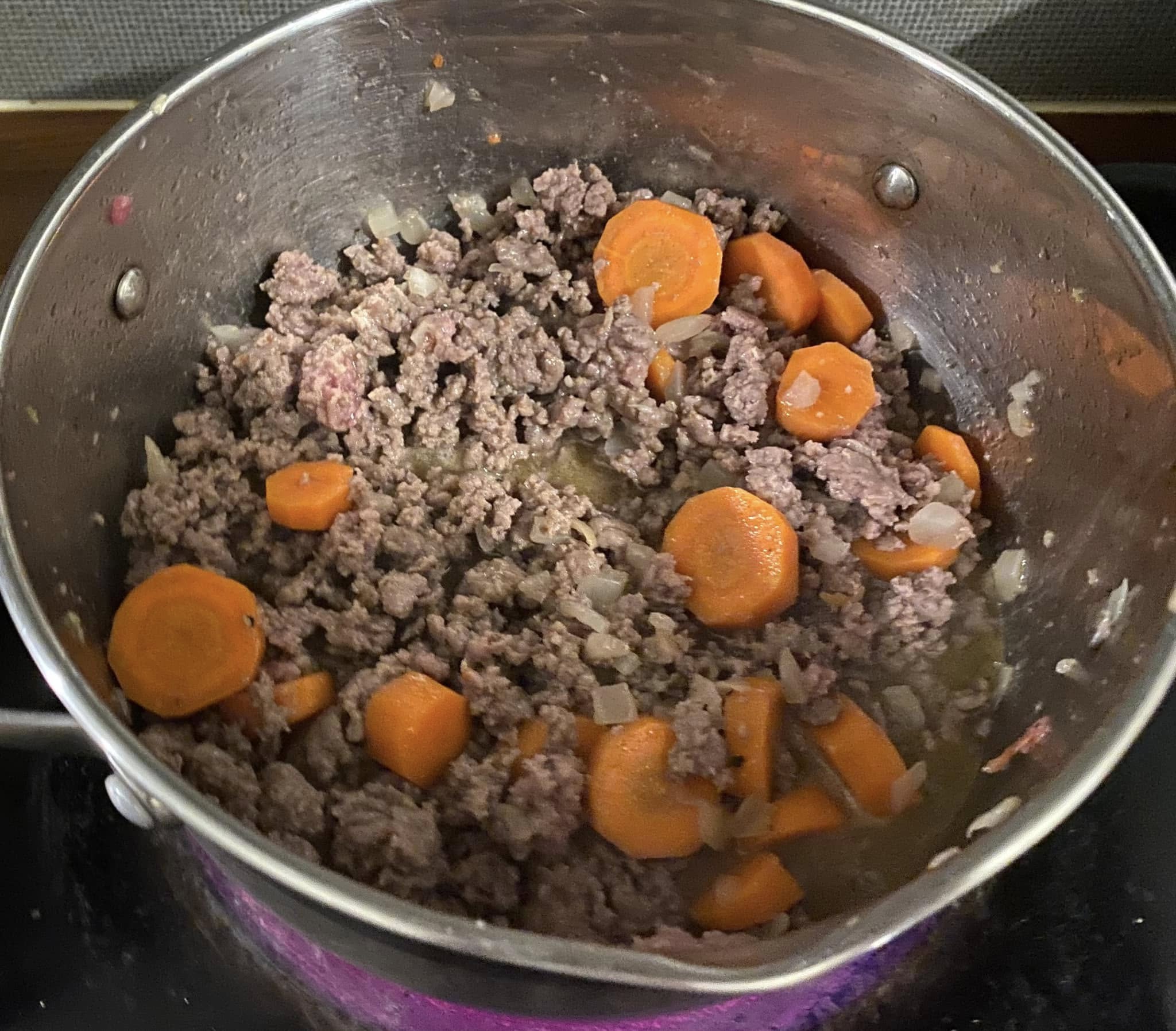 In una pentola versiamo due o tre cucchiai di olio evo e riscaldiamo a fiamma media. Inseriamo prima la cipolla ben tagliata finemente, aggiungiamo un filo di sale e la facciamo sudare un poco, per poi aggiungere i due spicchi d’aglio tritati e le carote tagliate a rondelline. Pepiamo e saliamo quanto basta e aggiungiamo le scaglie di peperoncino. Mescoliamo costantemente a fiamma media per 4 minuti circa. Facciamo sudare per poi inserire la carne macinata ( a piacere salsiccia ) e incominciamo a romperla con la spatola, cuociamo a fiamma vivace e aromatizziamo con il soffritto mescolando continuamente.
