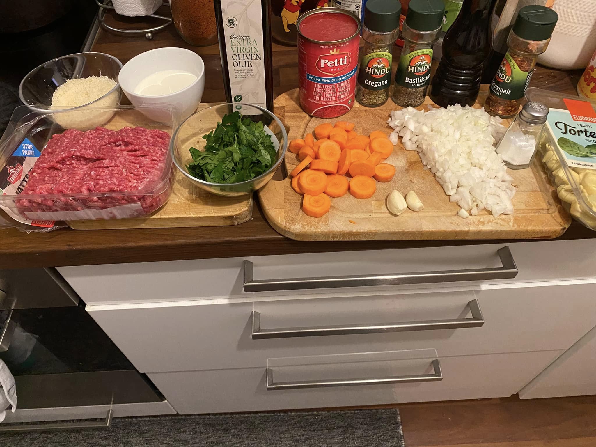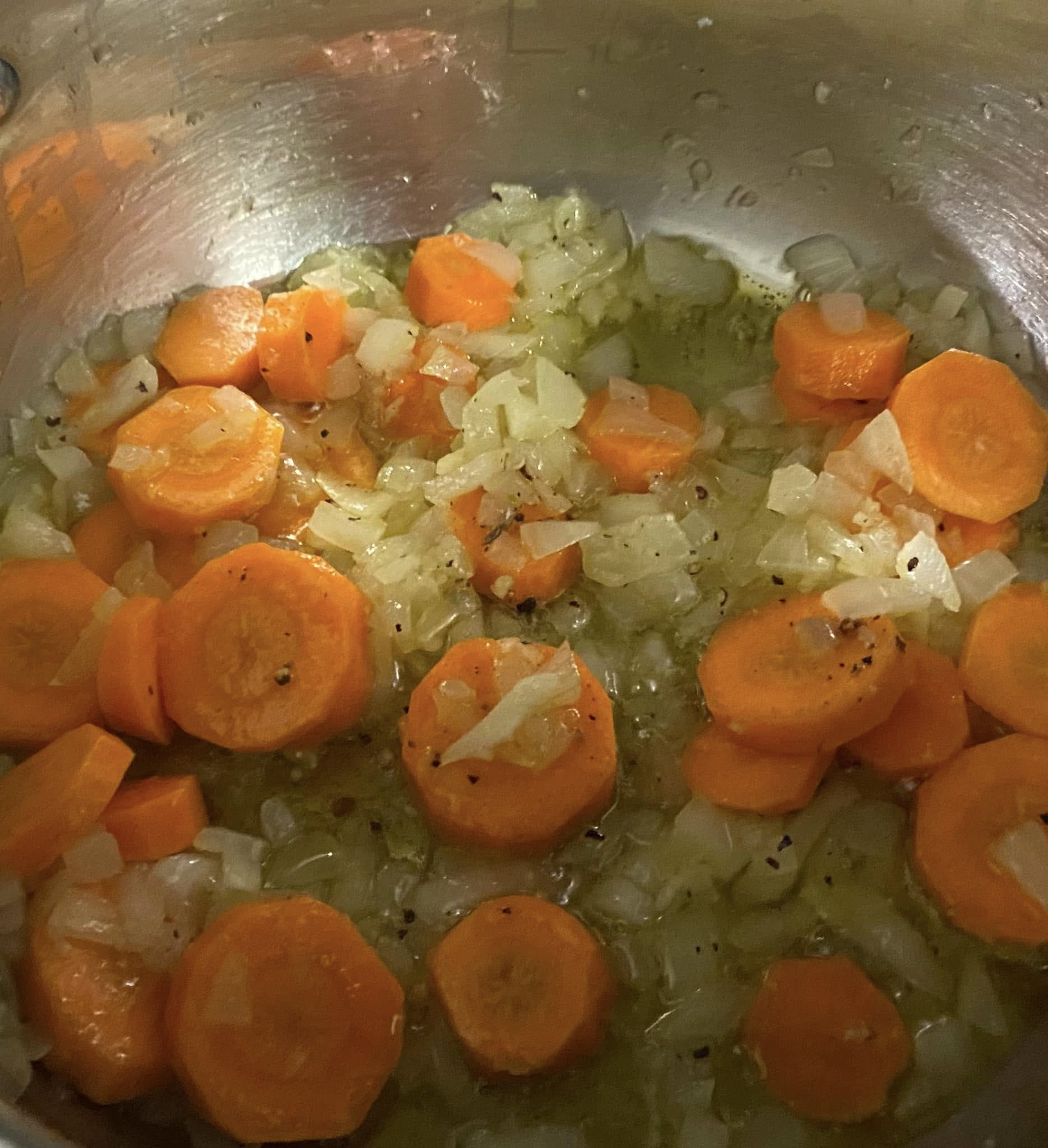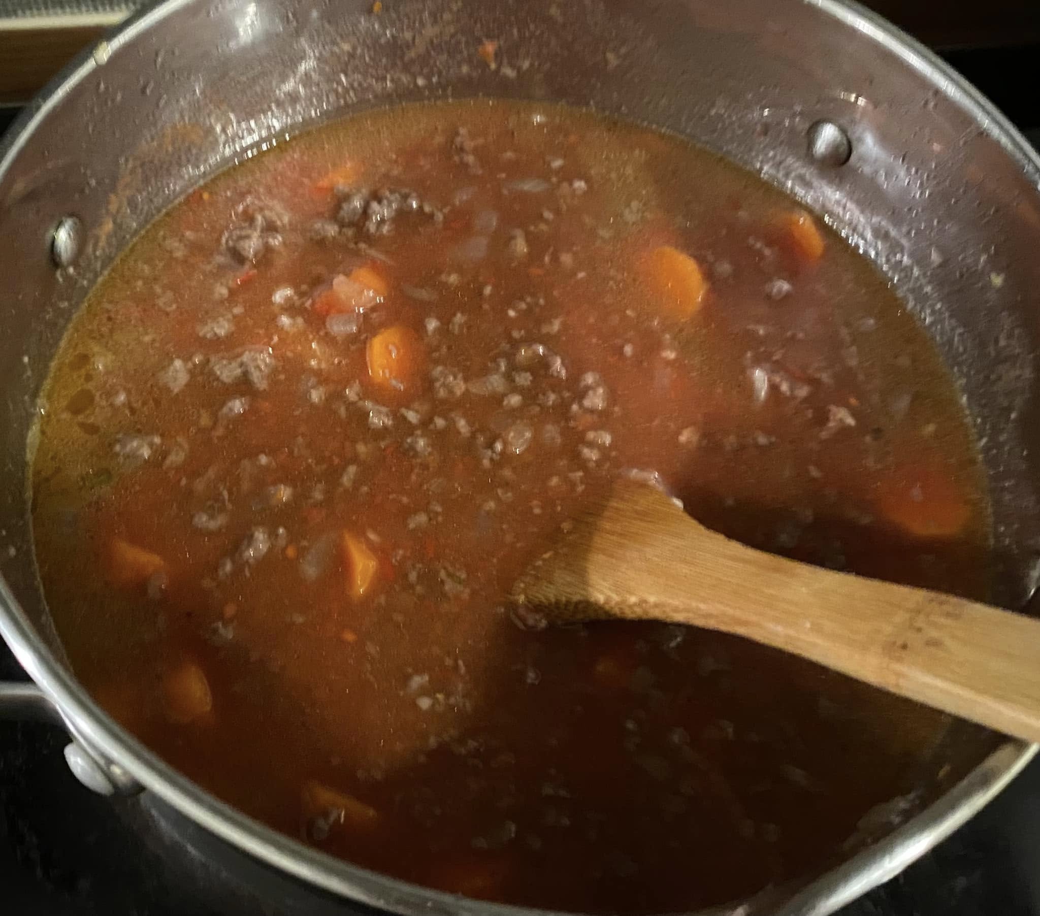 In una pentola versiamo due o tre cucchiai di olio evo e riscaldiamo a fiamma media. Inseriamo prima la cipolla ben tagliata finemente, aggiungiamo un filo di sale e la facciamo sudare un poco, per poi aggiungere i due spicchi d’aglio tritati e le carote tagliate a rondelline. Pepiamo e saliamo quanto basta e aggiungiamo le scaglie di peperoncino. Mescoliamo costantemente a fiamma media per 4 minuti circa. Facciamo sudare per poi inserire la carne macinata ( a piacere salsiccia ) e incominciamo a romperla con la spatola, cuociamo a fiamma vivace e aromatizziamo con il soffritto mescolando continuamente.