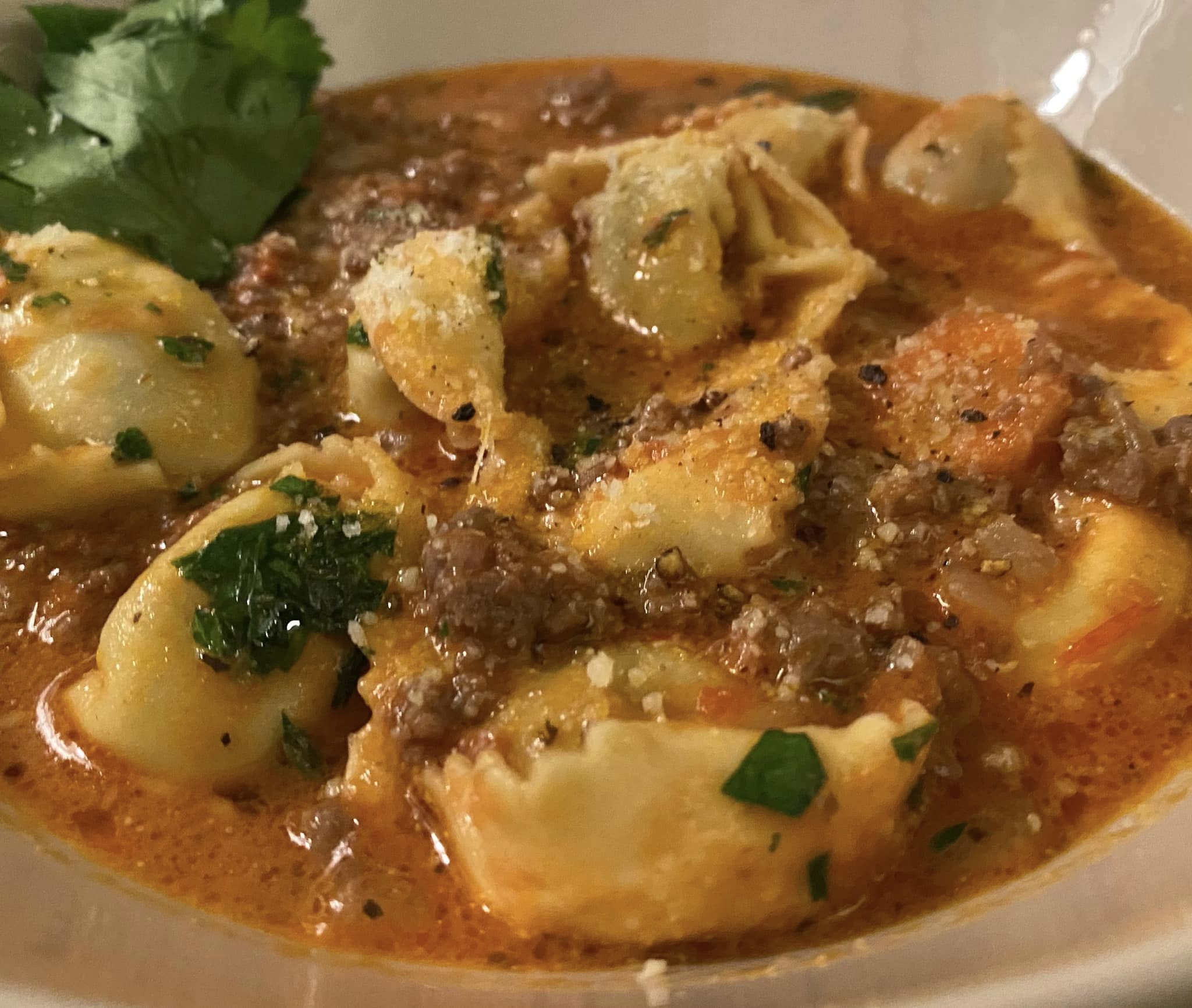 Adesso che la carne e’ ben imbrunita ed ha rilasciato i suoi liquidi sfumiamo con il vino e asciughiamo a fuoco vivace. Aggiungiamo i pomodori pelati gia’ tritati e il brodo, alziamo la fiamma per poi abbassarla al bollore. E’ la volta degli aromi: origano e basilico, mescoliamo e cuociamo per 10 minuti circa a fiamma media bassa con coperchio. Possiamo quindi inserire i tortellini o tortelloni attenendoci alle istruzioni per il tempo di cottura. Dopo 4 minuti circa inseriamo il latte, mescoliamo, poi il parmigiano e ritiriamo dal fuoco. Spolveriamo con del prezzemolo a fiamma spenta. Lasciamo riposare alcuni minuti prima d’impiattare e servire. Una zuppa gustosa al sapore mediterraneo