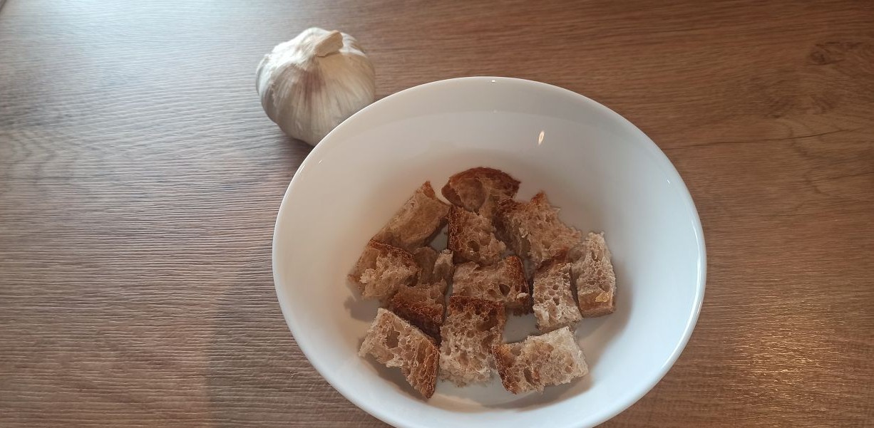 Nel frattempo, tostate le fette di pane, profumatele con l’aglio e tagliatele a dadini. Sul fondo di una ciotolina, disponete i dadini di pane,