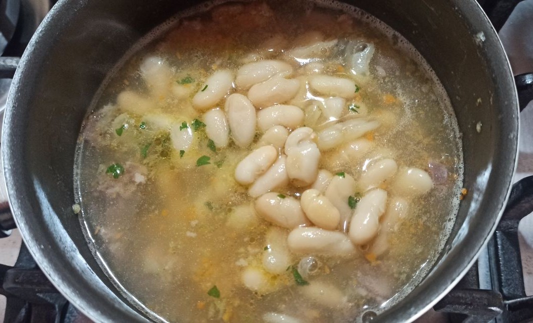 Sfumate con il vino bianco. Appena l’alcol sarà evaporato, aggiungete i fagioli cannellini, con un poco di acqua di cottura, regolate di sale, fate cuocere per dieci minuti.