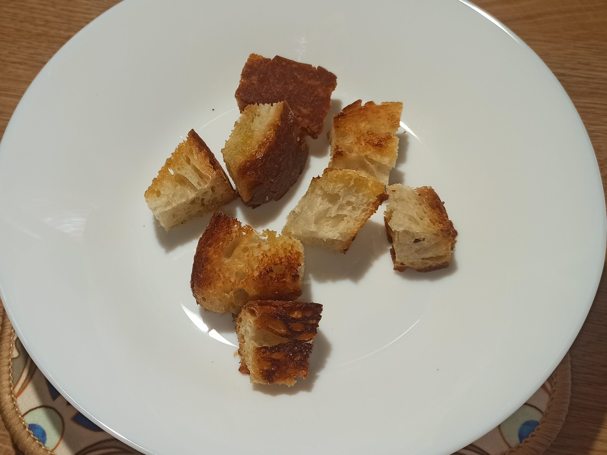 Nel frattempo tagliate le fette di pane a dadini, in una capiente padella mettete un giro d’olio evo, aggiungete i dadini di pane, e fateli rosolare a fiamma media.