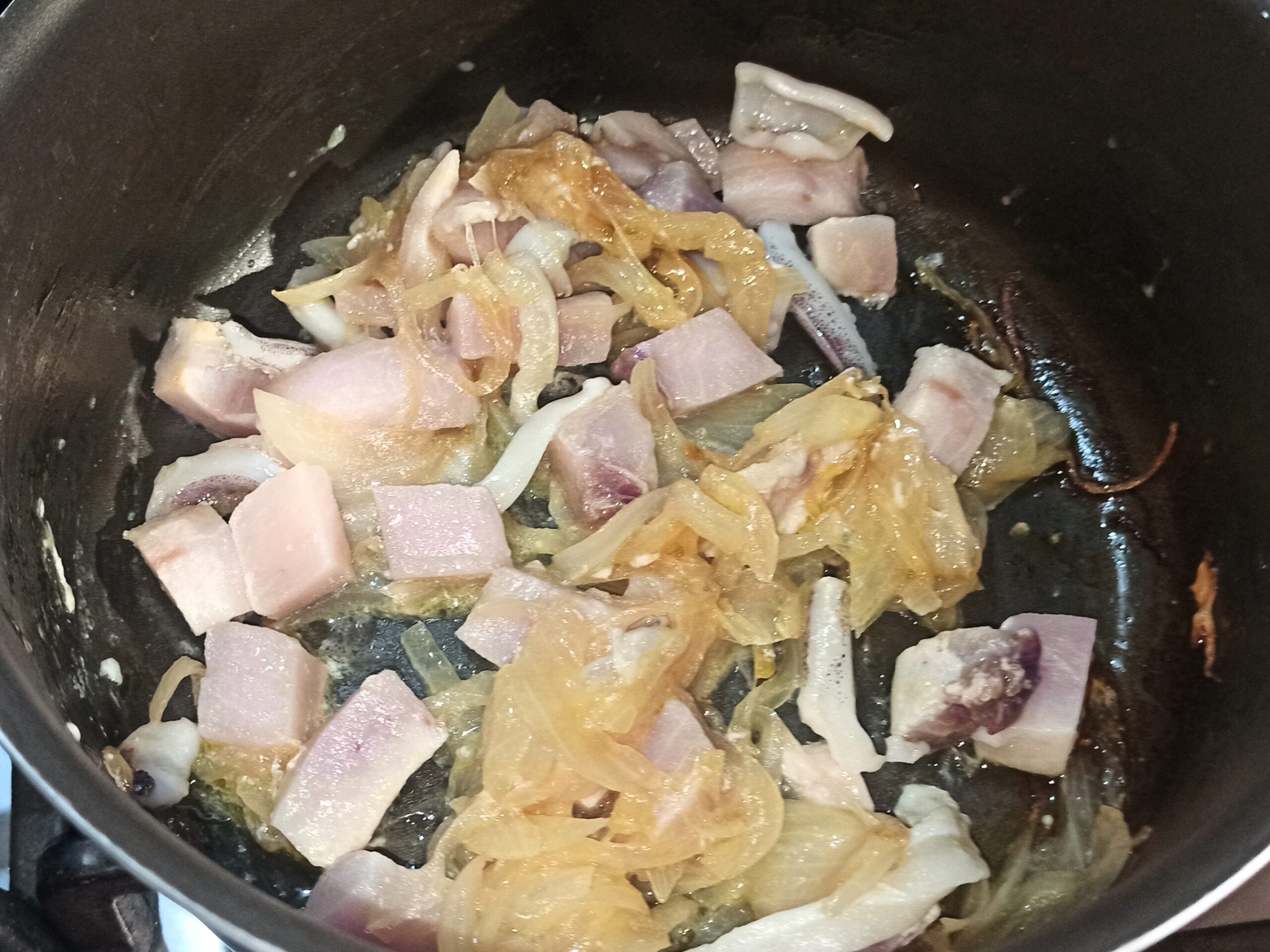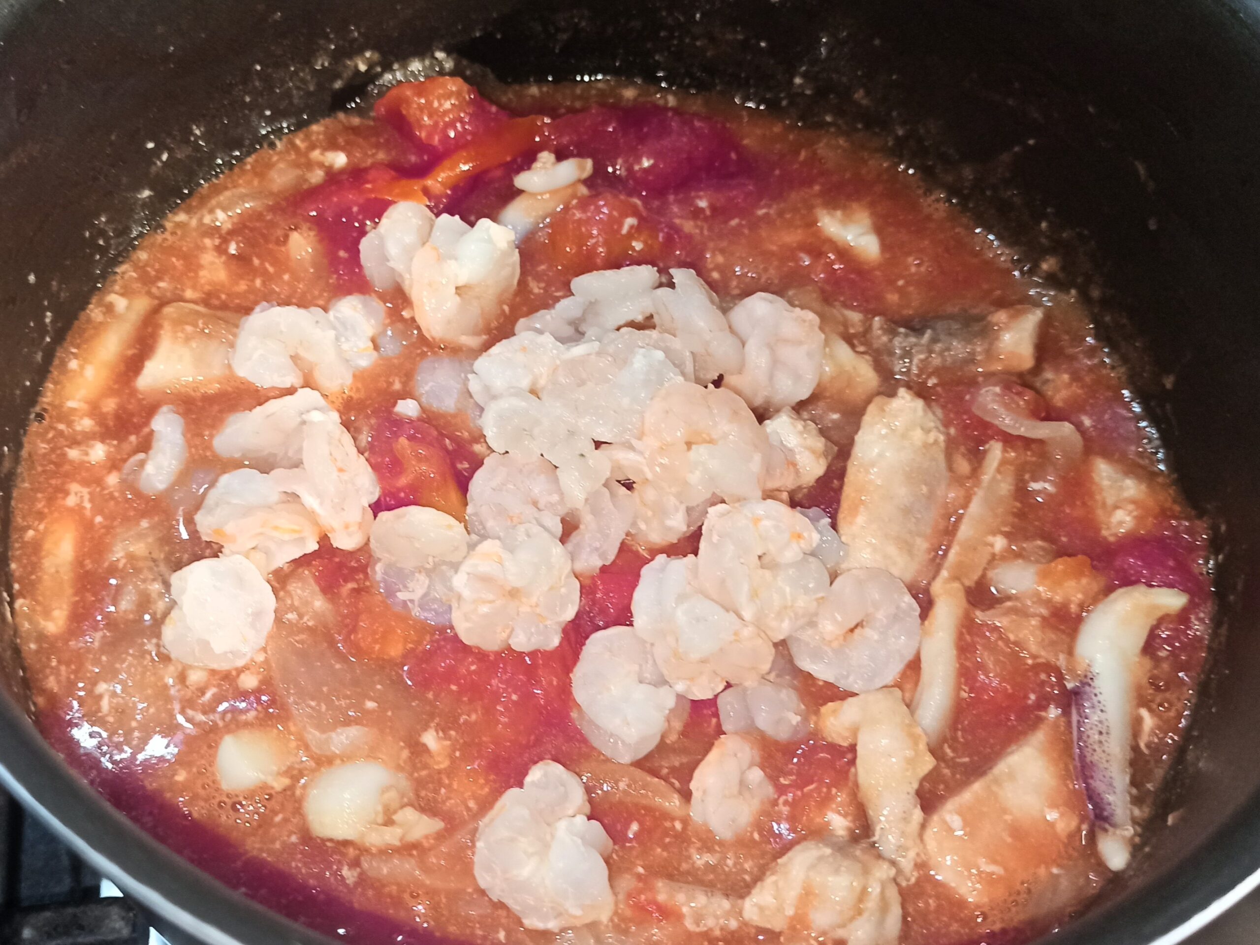 sgusciate anche i gamberetti, eliminate il filo nero. Appena le cipolle risulteranno morbide, aggiungete un bicchiere di brodo vegetale, e fate cuocere a fiamma bassa per circo un’ora. Trascorso questo tempo, fate asciugare l’eventuale sugo restante e aggiungete il pesce spada, fate rosolare per un minuto, aggiungete anche il calamaro.