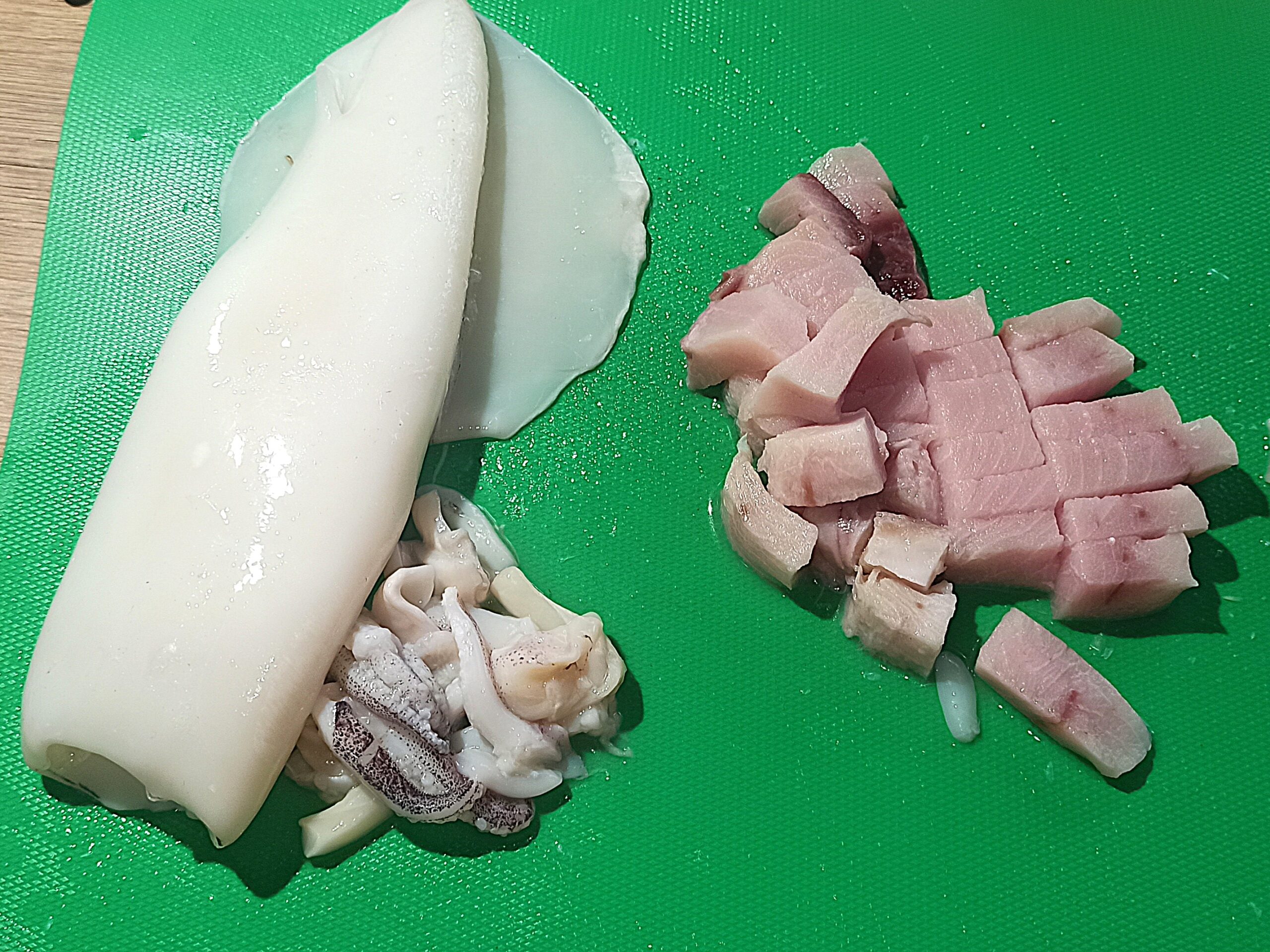 Nel frattempo, lavate e pulite il calamaro e tagliatelo a pezzetti, sciacquate e tagliate a pezzetti anche il pesce spada