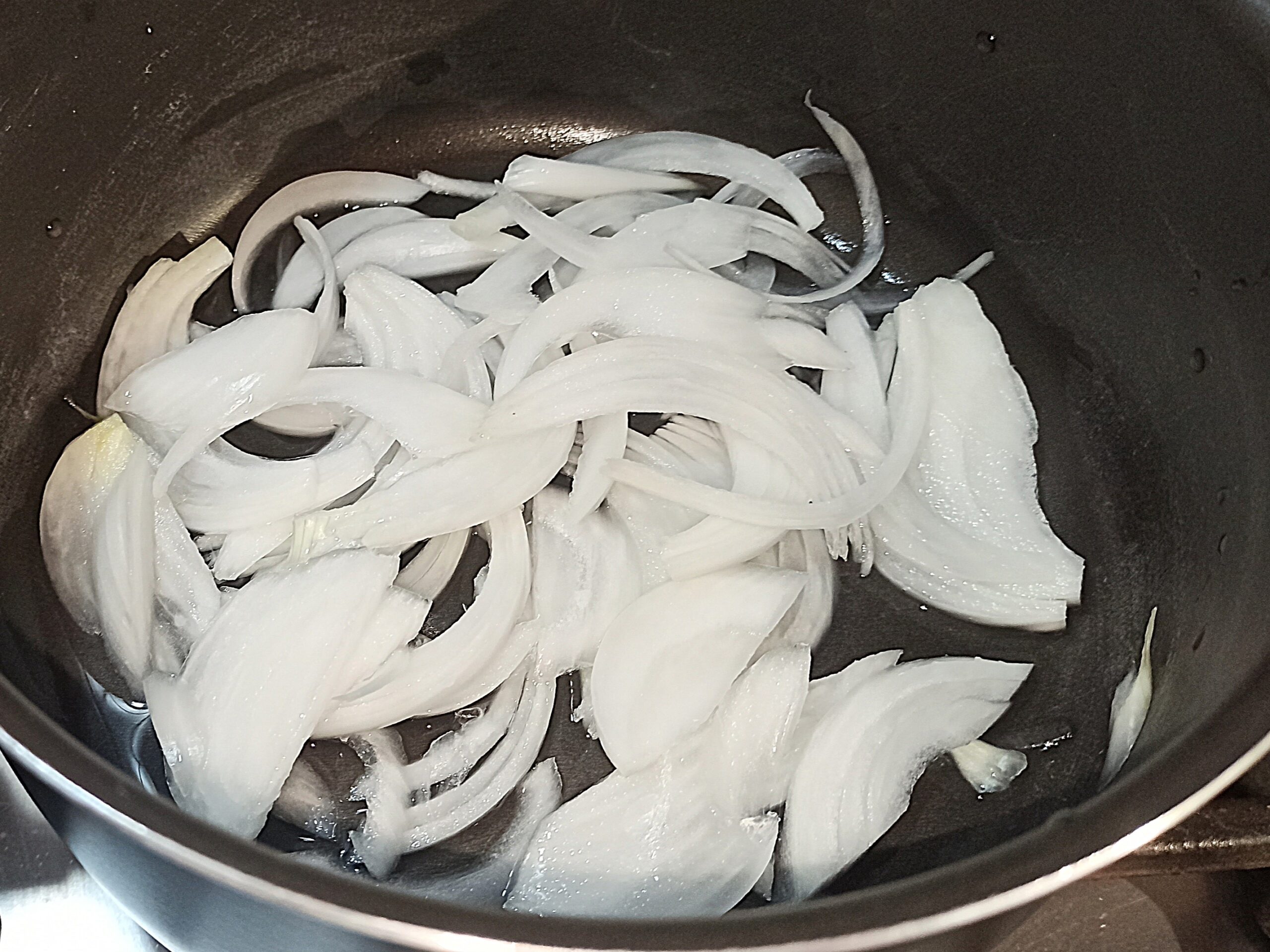 Per preparare la zuppa di cipolle alla marinara, iniziate a sbucciare le cipolle, lavatele e tagliatele a fettine sottili. In una capiente pentola, mettete un giro abbondante di olio evo, unite le cipolle, e fatele ammorbidire a fiamma bassa, con la pentola coperta.