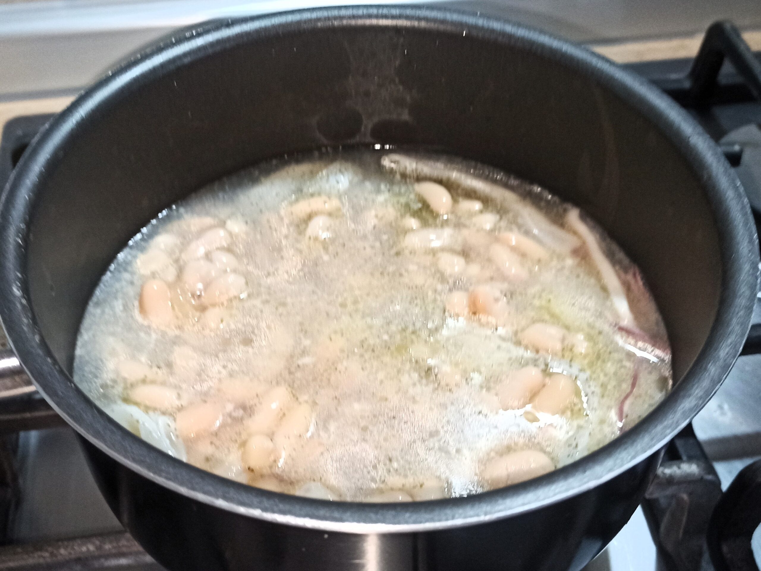 Appena l’alcol sarà evaporato, aggiungete i fagioli, un bicchiere d’acqua, e fate cuocere per dieci minuti.