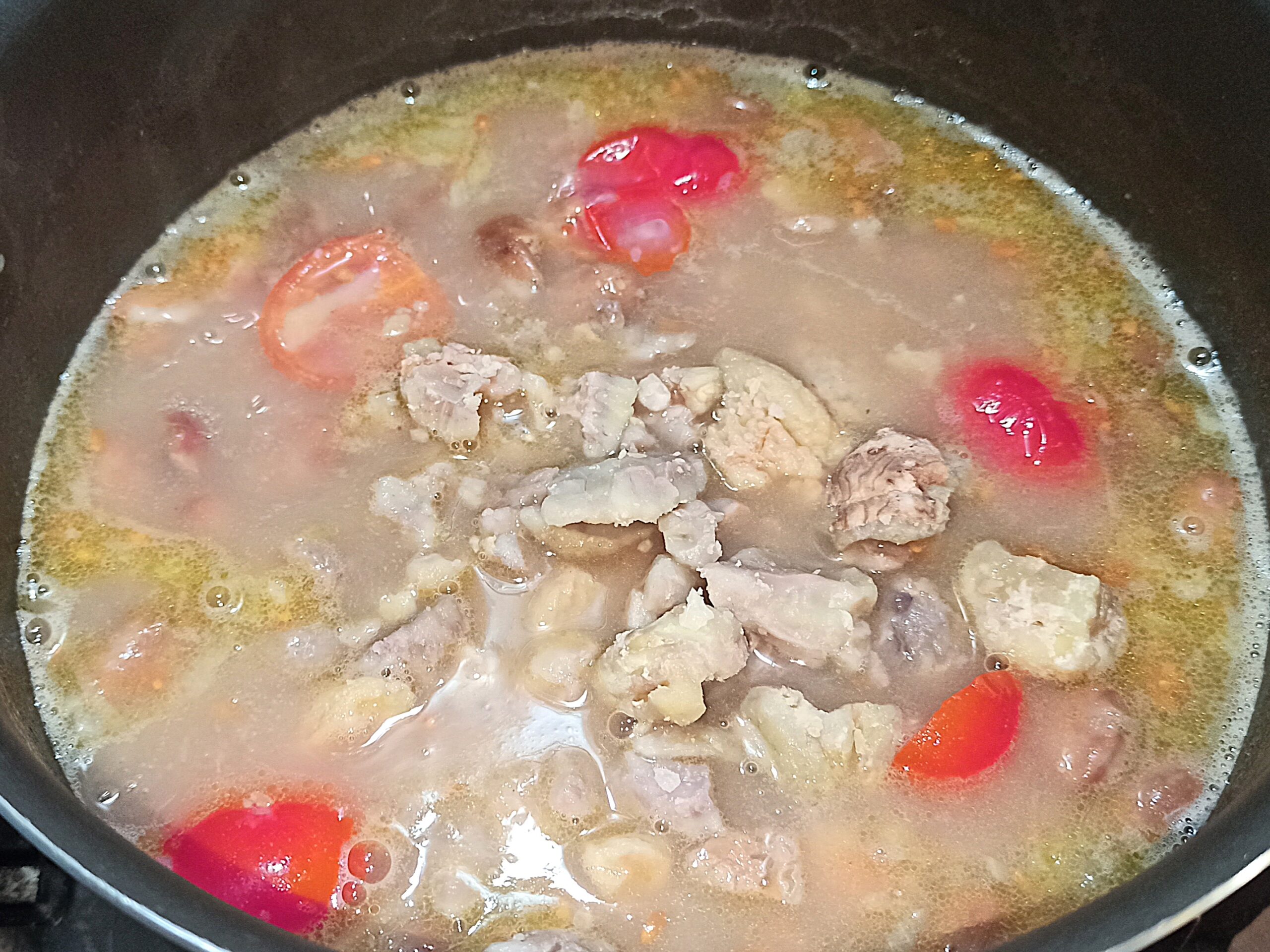 aggiungete un paio di bicchieri d’acqua, i pomodorini tagliati in quattro, regolate di sale e fate cuocere per dieci minuti. Trascorso questo tempo, aggiungete le castagne, e fate insaporirei a fiamma bassa per altri dieci minuti.