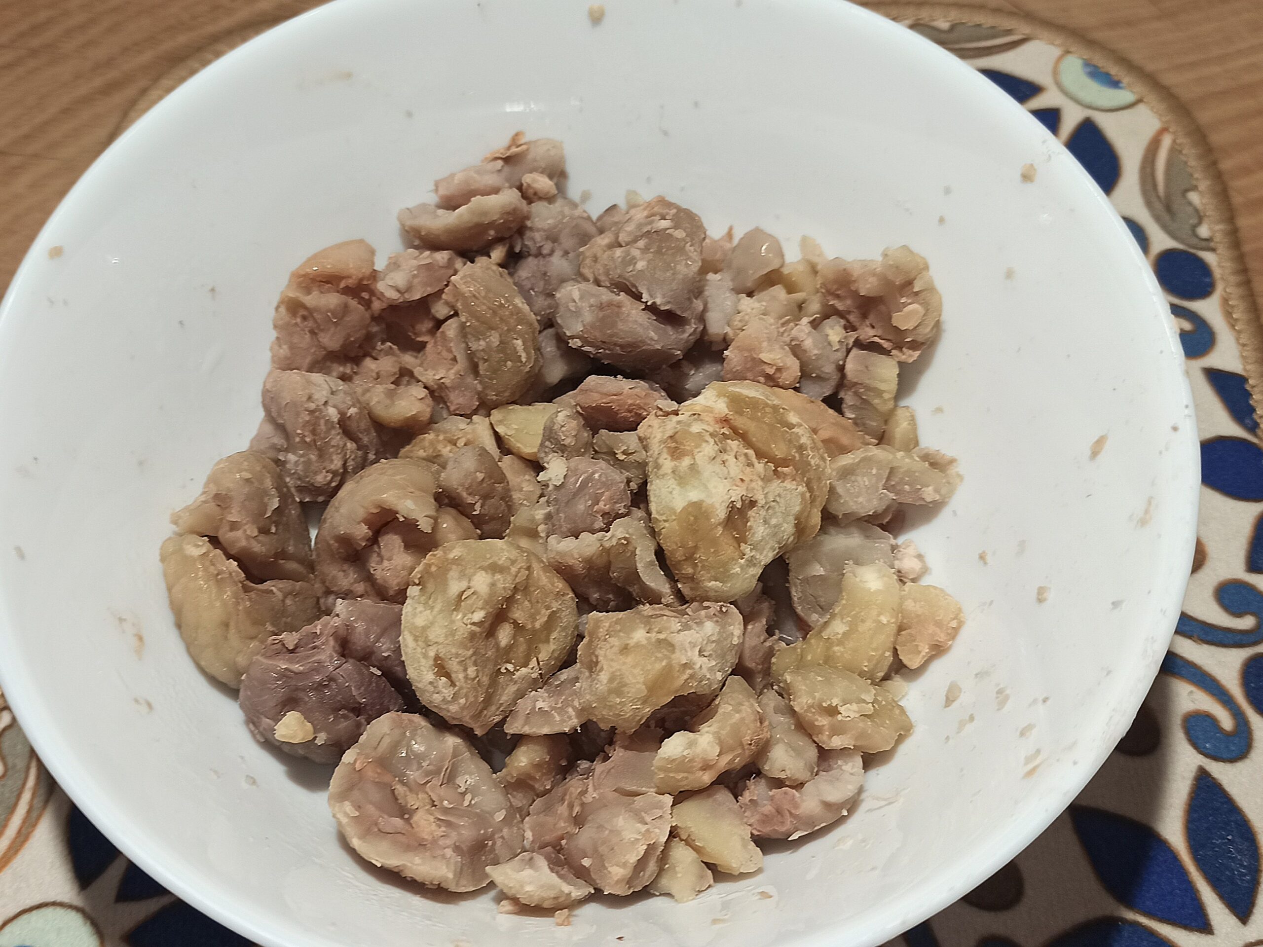 Per preparare la zuppetta vegetariana di borlotti e castagne, iniziate a lavare, sbucciare e lessare le castagne. Appena lessate, fatele intiepidire, ed eliminate anche la pellicina esterna. tagliatele grossolanamente.