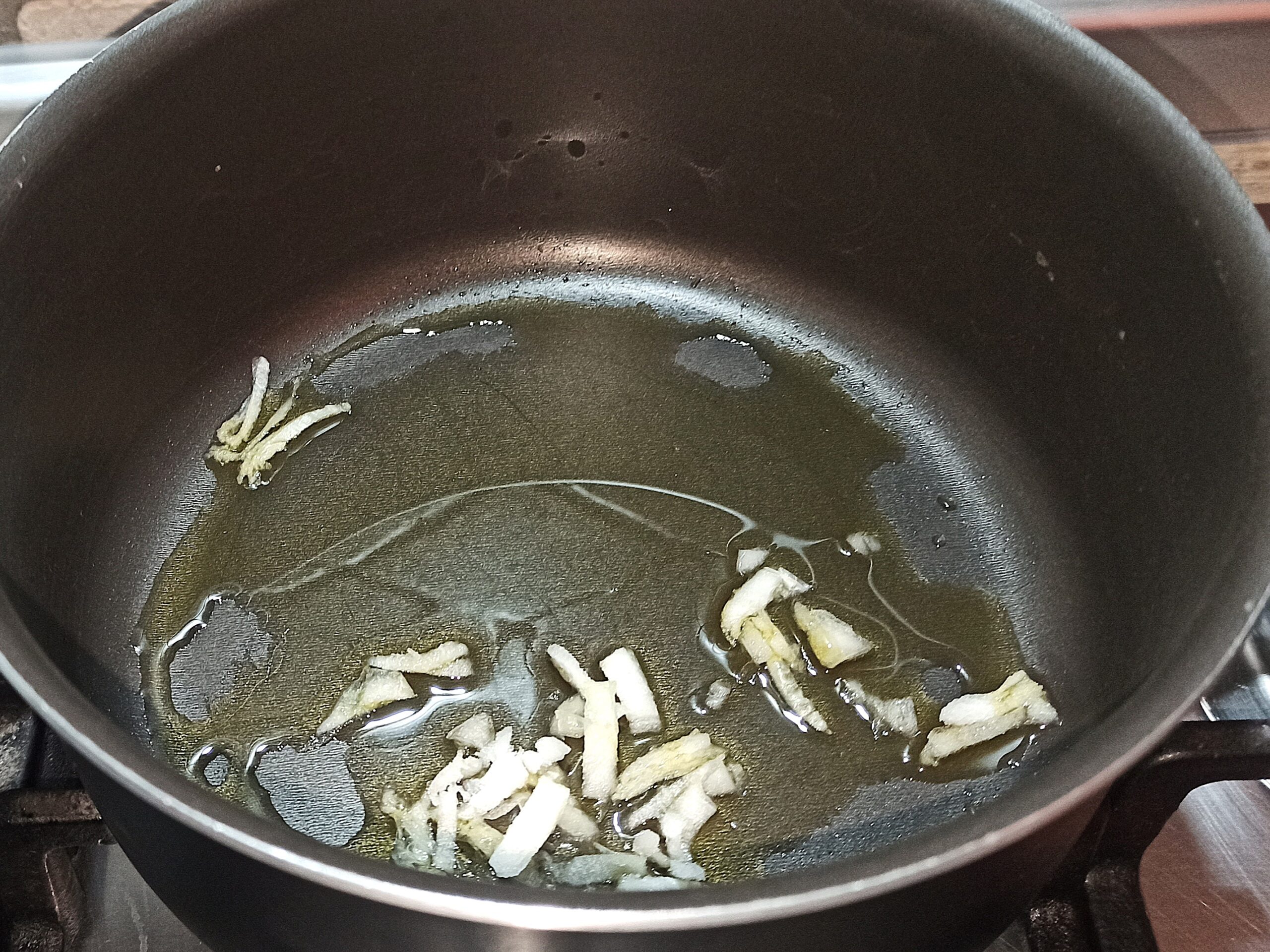 In un pentolino, mettete un giro d’olio evo, unita la cipolla tagliata a fettine sottili, fate sfrigolare a fiamma media.